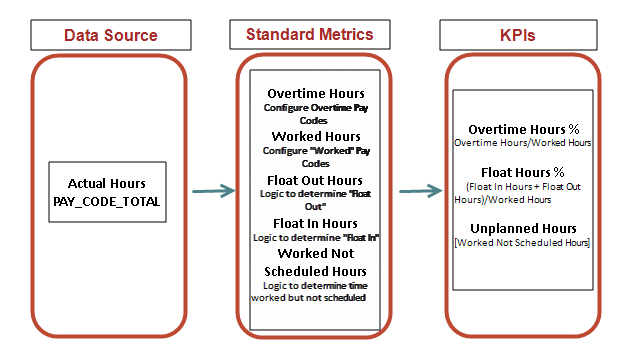 In the following illustration, the Actual Hours domain function extracts data from the Actual Hours data source (the PAY_CODE_TOTAL table in the transactional database), and transforms the data through business logic to create the five metrics listed. Ultimately, calculations are applied to the metrics to create Key Performance Indicators.