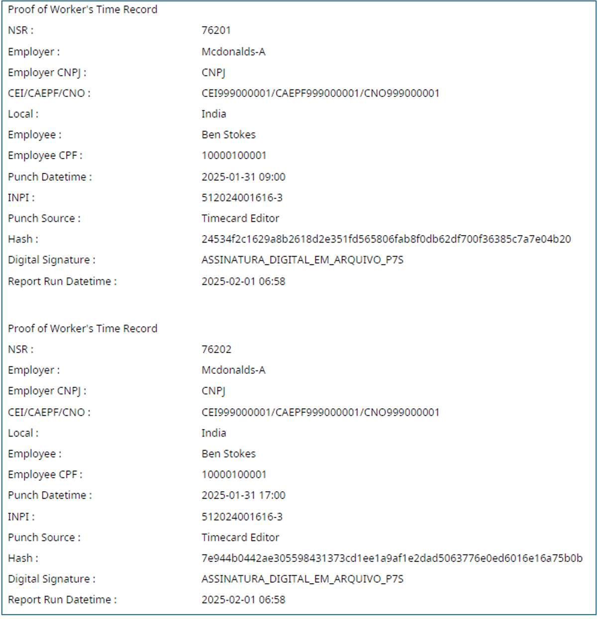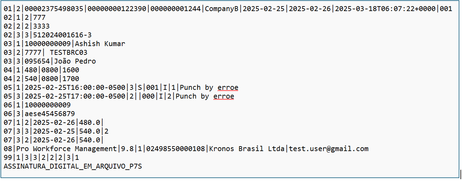| Hash: | Hash code for the punch | Hash code (SHA-256) of the punch. Exclusively for REP-A and REP-P employees. | The Hash Code is created for a combination of three fields NSR, Punch Date Time, Employee CPF. | |